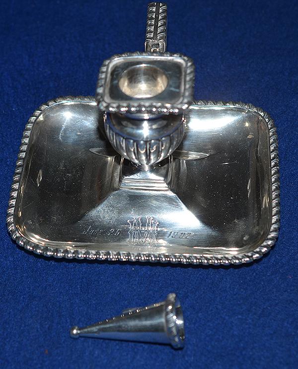 silver dish with small candle stick with carrying handle and complete with detachable silver snuffer. Silver marks for Chester 1902, the makers initials are hard to read now. Engraved with original owners initials and date 25th of June 1902. Near mint.