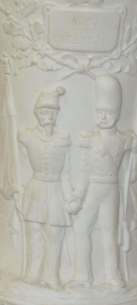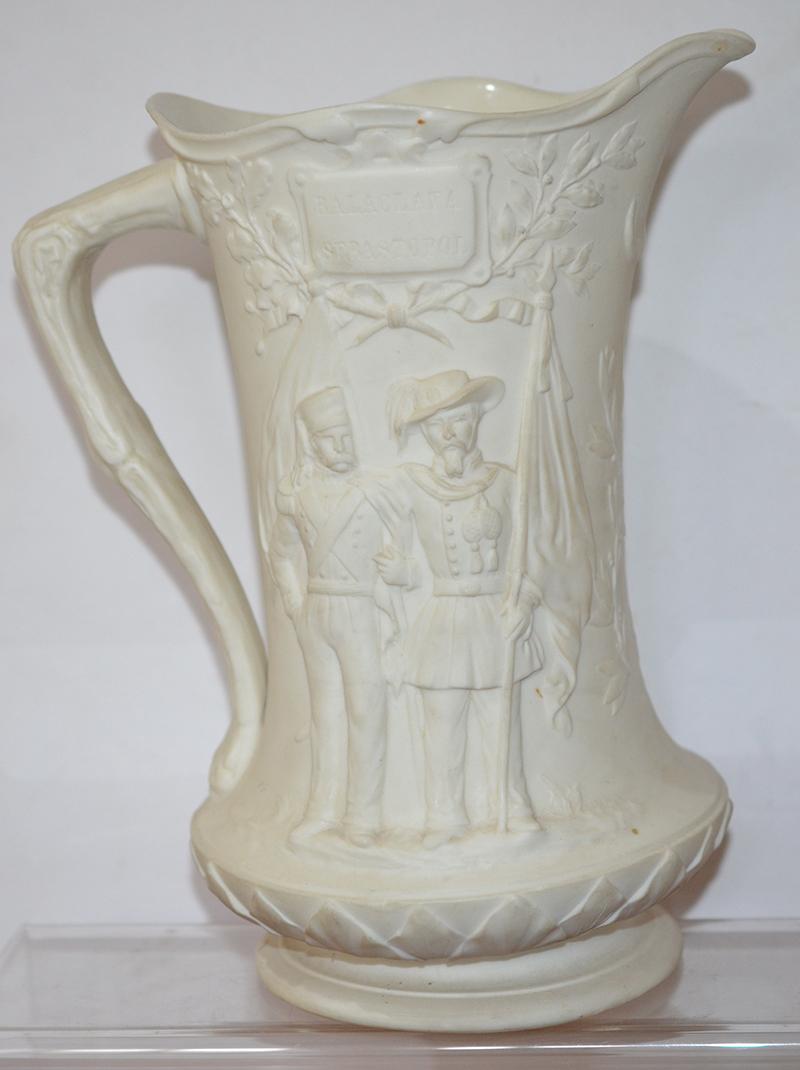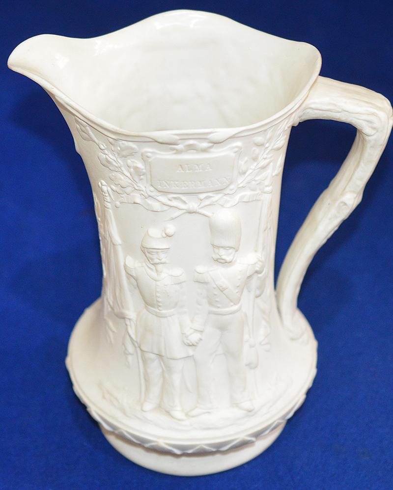 Large white parian ware jug featuring the depiction of four Crimea soldiers in full uniform with flags and standards and two plaques with battle honours, all set in a floral background. Height 10 inches or 26cm and very impressive. Mint condition.