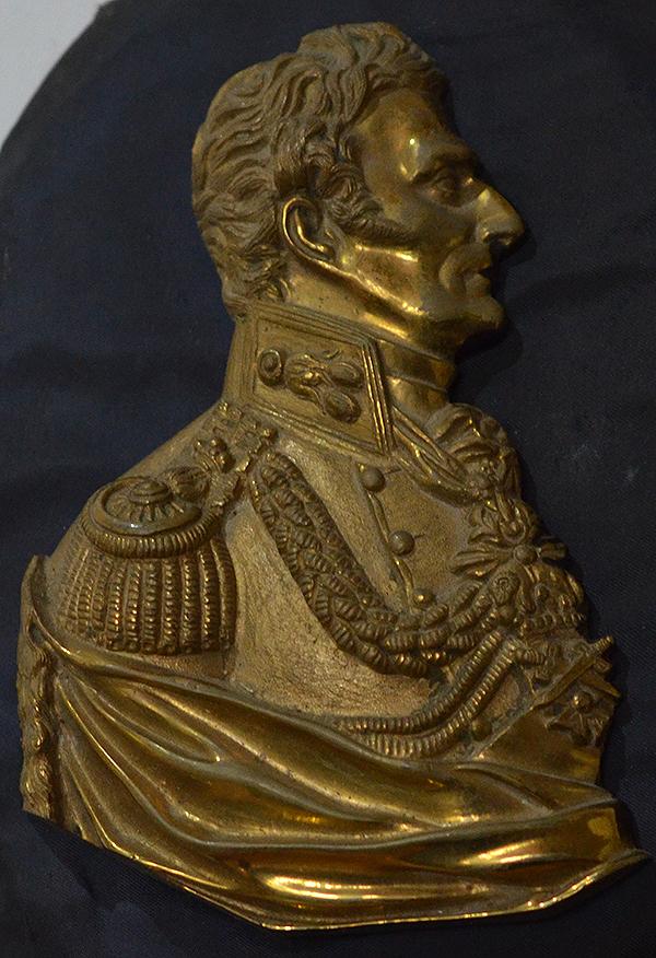 A finely cast gilt metal head and shoulder profile of the Duke of Wellington wearing full military uniform with awards. The plaque still retains almost all original gilt finish and it is in almost mint condition. The figure is mounted on its original black silk covered wooden wall plaque. 10 inches or 26cm.