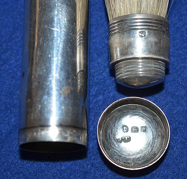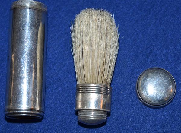 The shaving brush is produced in three silver detachable parts with the original shaving brush still in place. Silver hall marks for London 1792 and maker marked JT.
