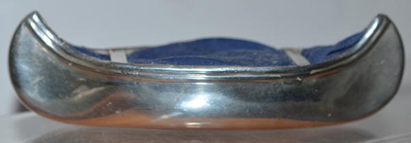A very nice and extra large silver pin cushion designed as a canoe. Silver hallmarks for Birmingham 1906 with makers initials. Size 13cm long. Very nice condition,