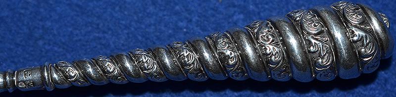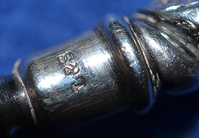 A long silver toasting fork measuring over 12 inches or 30cm long. Very ornate handle which is silver hall marked, Birmingham 1888 and with makers initials L & S. Very nice condition.
