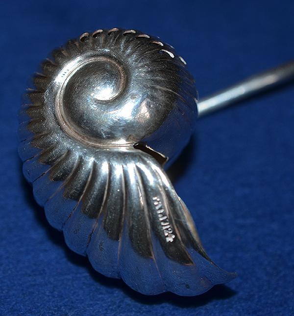 A very unusual sugar sifting spoon. Realistic sea shell design with ornate long handle. Silver marks for George Brown Birmingham 1900 and also stamped with a design registration number.