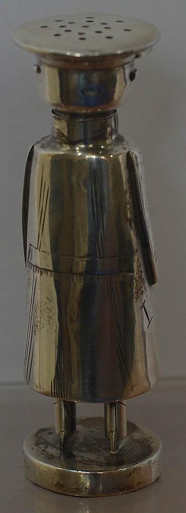 A superb silver sifter designed as a chauffer wearing a long coat with double row of buttons, he is wearing driving goggles and wearing a peeked cap. Silver marks for Chester 1906 and with the makers initials for Saunders & shepherd. The base is also stamped with a registration number for this rare silver model.