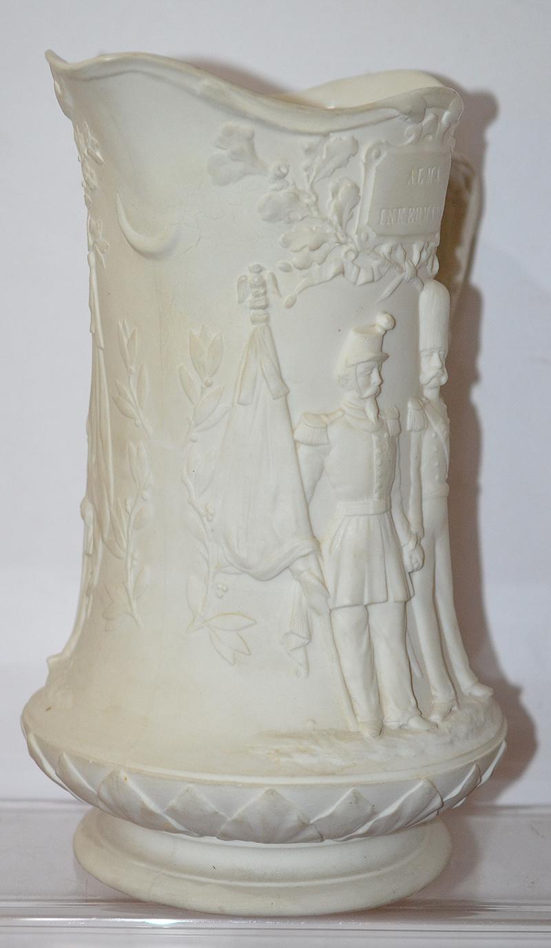 Large white parian ware jug featuring the depiction of four Crimea soldiers in full uniform with flags and standards and two plaques with battle honours, all set in a floral background. Height 10 inches or 26cm and very impressive. Mint condition.