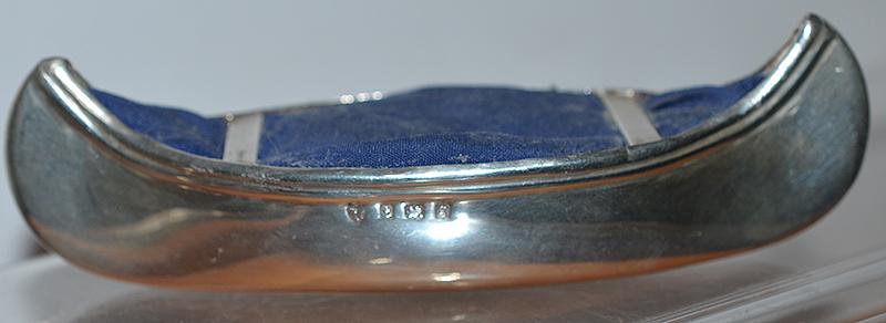 A very nice and extra large silver pin cushion designed as a canoe. Silver hallmarks for Birmingham 1906 with makers initials. Size 13cm long. Very nice condition,