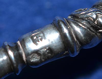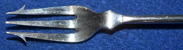 A long silver toasting fork measuring over 12 inches or 30cm long. Very ornate handle which is silver hall marked, Birmingham 1888 and with makers initials L & S. Very nice condition.