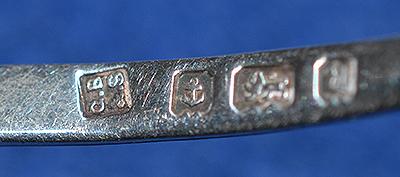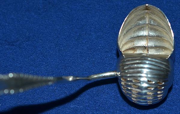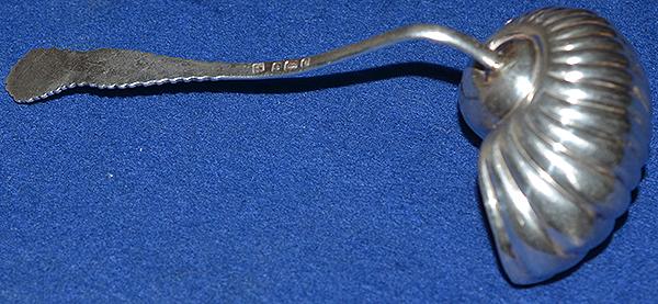 A very unusual sugar sifting spoon. Realistic sea shell design with ornate long handle. Silver marks for George Brown Birmingham 1900 and also stamped with a design registration number.