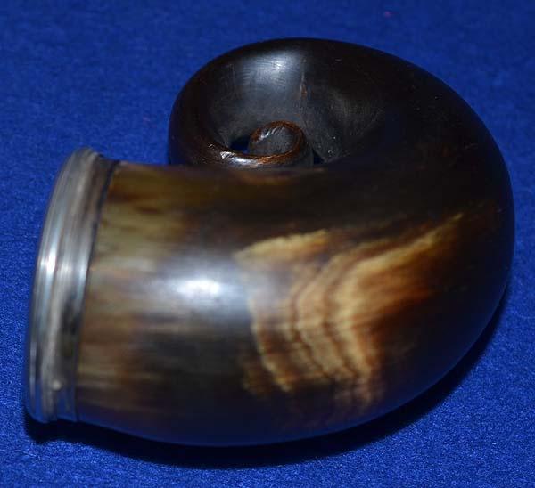 A superb horn snuff mull by one of the greatest and most desirable silversmiths of all time, Nathaniel Mills. A very nice carved animal horn with attractive natural patterns, hinged silver lid with silver hallmarks for Nathaniel Mills of Birmingham 1831. A rare and very attractive snuff box. read more