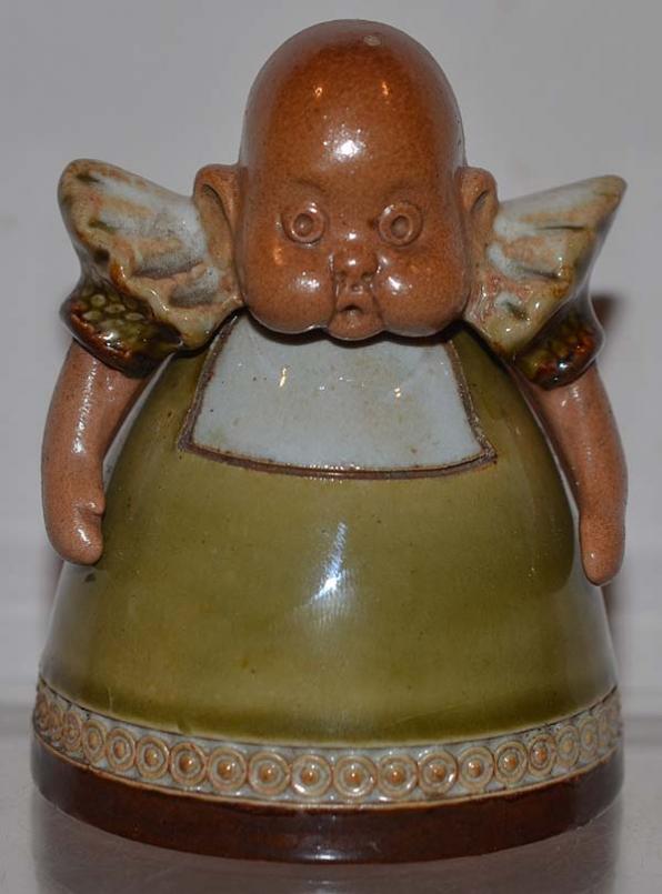 A rare full colour novelty stoneware inkwell modeled as a baby, lifting the the baby's head reveals the inkwell. Base is marked with Royal Doulton pottery stamp, model number and design registration number.The main flaw with this pattern inkwell is that the stoneware and metal hinge often breaks and the head then becomes detached probably because they are top heavy, the example I have available... read more